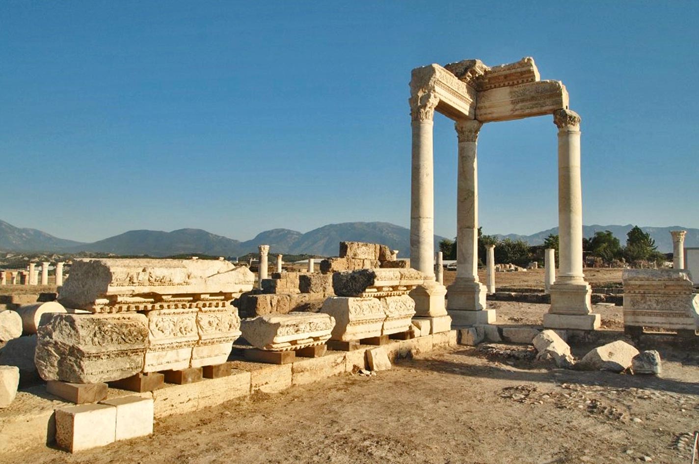 Ancient City of Laodikeia is located on 6 km north of Denizli city. The Hellenistic city had been founded by Seleucus King Antiochus II in the name of his wife Laodike in the middle of century 3 BC. The region then had become the part of Roman Republic and later the Roman Empire. The city having one of the first 7 churches of Christianity had been a religious centre at metropolitan level during the pre-Byzantine period. The excavations in Laodikeia proved that there had been permanent settlements in pre Chalcolitic Period (from 5500 BC in Copper Age to 7th century).