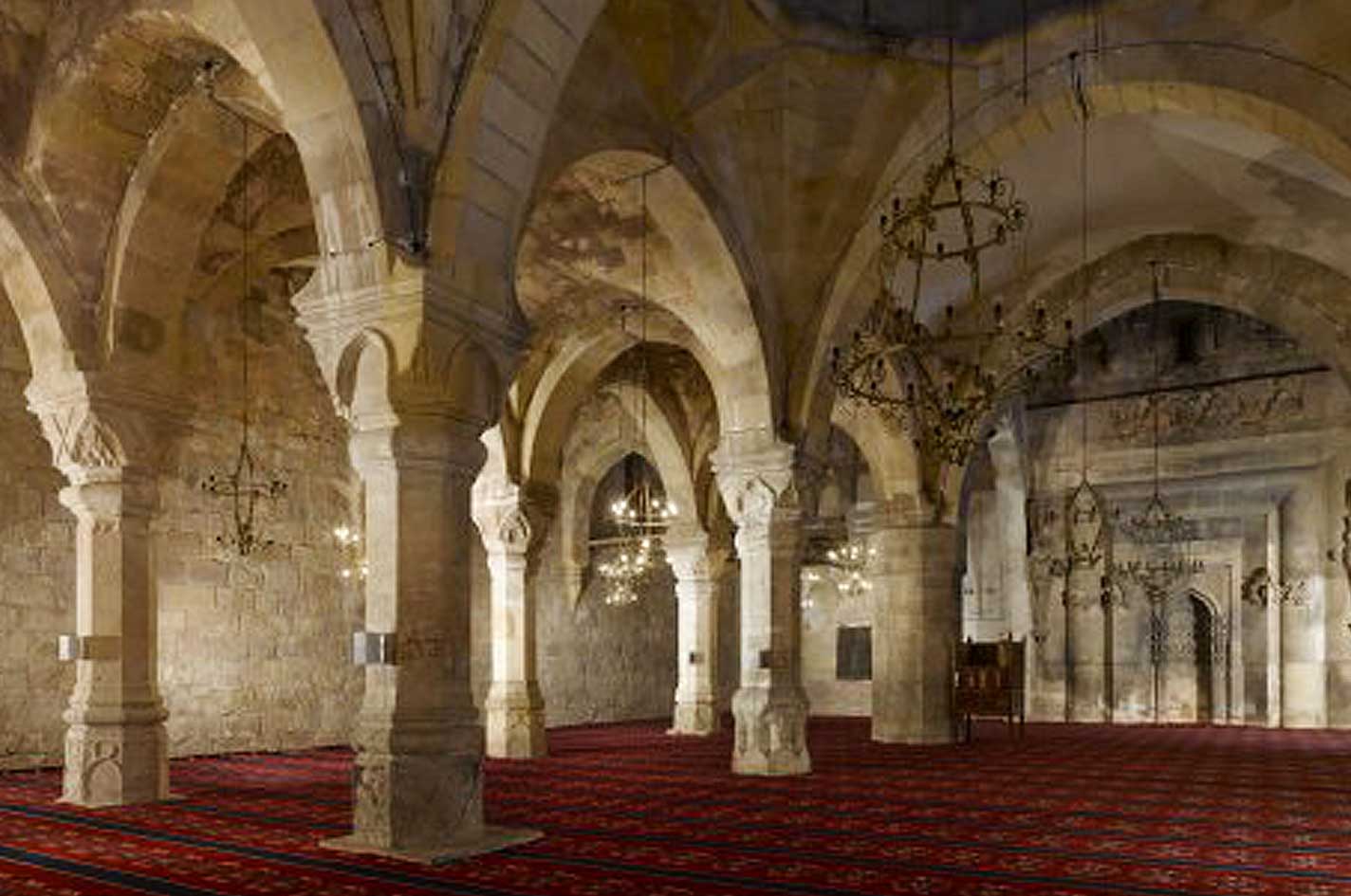 The sole prayer room in the great mosque has five aisles, each consisting of five bays. It has stone vaulting and above are two cupolas of unequal size. One is above the ablutions basin and the other is above the mihrab (prayer niche). The second cupola is the principal one, recognizable from the exterior by its hexagonal spire.
